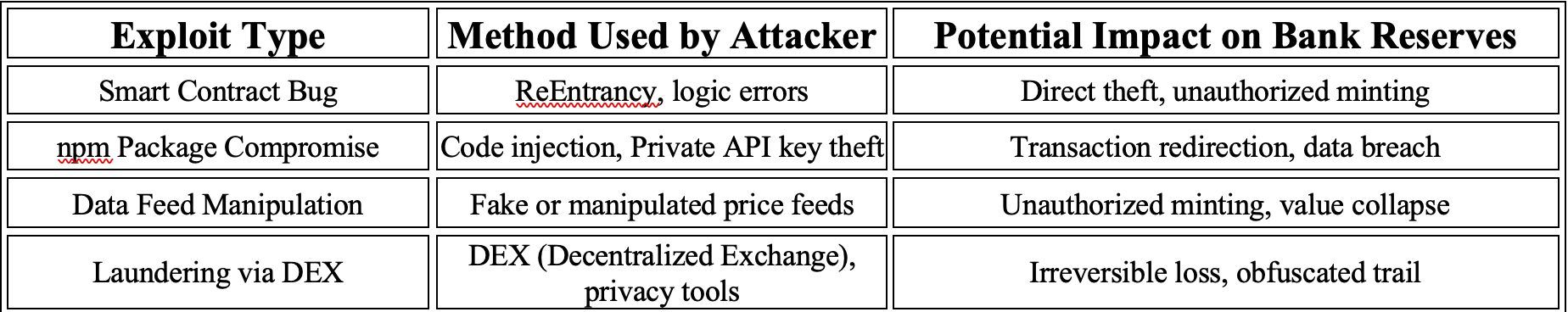 A real-world stablecoin banking hack example is a $49.5 million theft from a DeFi protocol, where attackers exploited a smart contract vulnerability, drained reserves, and laundered funds within minutes (https://hoploninfosec.com/stablecoin-bank-hacked/). Such incidents highlight the potential for rapid financial losses and insolvency if banks’ stablecoin systems are compromised. Here is a table of common exploit types, methods of attacking, and how they can impact bank reserves: